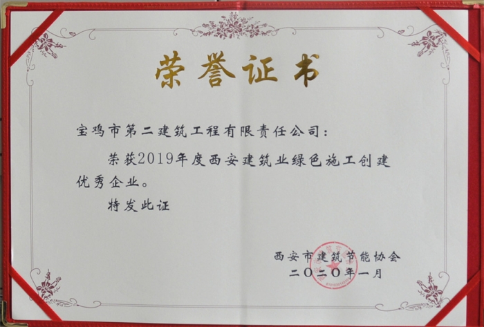 近日,從西安市建筑節(jié)能協(xié)會(huì)傳來喜訊,公司榮獲“2019年度西安建筑業(yè)綠色施工創(chuàng)建優(yōu)秀企業(yè)”稱號(hào),公司董事長胥立榮獲“2019年度西安市建筑節(jié)能行業(yè)優(yōu)秀企業(yè)家”稱號(hào)。
