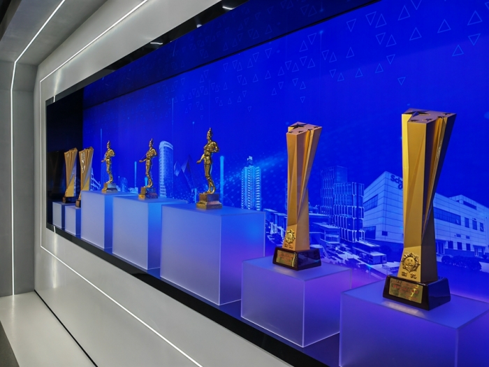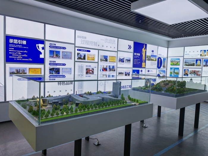 企業(yè)展覽館總面積516㎡,共分為四個展示單元,分別是:第一單元平地起高樓,主要展示集團公司歷史沿革;第二單元風(fēng)雨筑輝煌,主要展示集團公司壯闊征程;第三單元黨建強引領(lǐng),主要展示黨建、企業(yè)文化;第四單元公司榮譽展示;通過實物、展板、沙盤、模型、視屏、雕塑等表現(xiàn)手法,以圖、文、影、聲并茂的形式全方位呈現(xiàn)集團公司走過的艱辛之路、創(chuàng)新之路、豪邁之路。